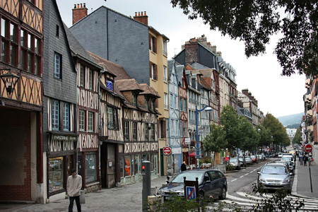 De Place du Vieux-Marche, het oude marktplein waar Jeanne d’Arc op 30 mei 1431 op de brandstapel werd gezet is omgeven door schitterende vakwerkhuizen.