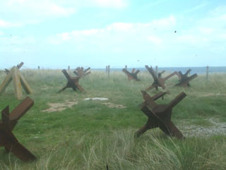 Aan het strand treft u diverse amfibievoertuigen, Duitse verdedigingselementen en een weids uitzicht op het strand.